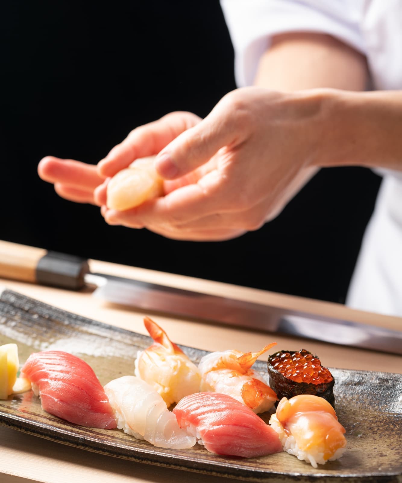 当店の寿司は、甘海老を始めとする季節の食材を使用しています。新鮮な食材を使用する事はもちろんですが、アットホームな店内でリラックスしながら食べて頂き、お客様の笑顔を見るのが私たちの目標です。